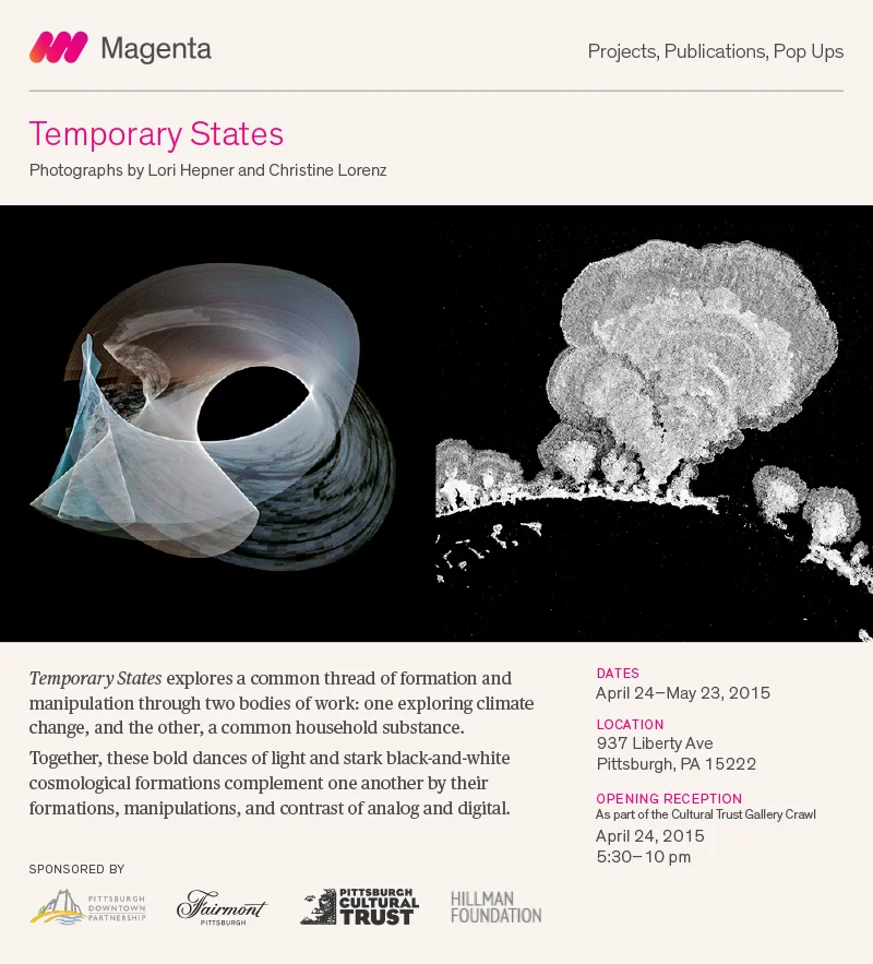 Temporary States pairs photographs from my Salt series with #Crowdsourced #Landscapes by Lori Hepner. The show is the creation of the magnificent Magenta Foundation, and thanks to the Pittsburgh Cultural Trust, we'll be a part of the Gallery Crawl in the Cultural District this April 24. The exhibition runs at 937 Liberty until May 23.